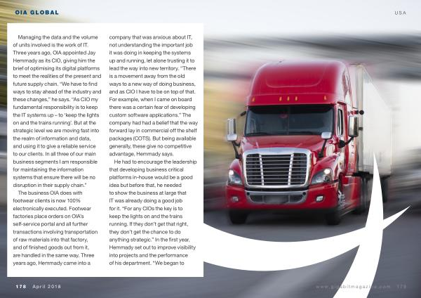 The business OIA does with footwear clients is now 100 % electronically executed . Footwear factories place orders on OIA ’ s self-service portal and all further transactions involving transportation of raw materials into that factory , and of finished goods out from it , are handled in the same way . Three years ago , Hemmady came into a company that was anxious about IT , not understanding the important job it was doing in keeping the systems up and running , let alone trusting it to lead the way into new territory . “ There is a movement away from the old ways to a new way of doing business , and as CIO I have to be on top of that . For example , when I came on board there was a certain fear of developing custom software applications .” The company had had a belief that the way forward lay in commercial off the shelf packages ( COTS ). But being available generally , these give no competitive advantage , Hemmady says .