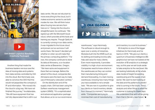 Another thing that made the business leaders nervous was the idea of moving data and systems from data centres controlled by OIA into the cloud . But Hemmady was able to convince the CEO that this would not jeopardise the company ’ s IP and information . “ We moved into the cloud in a big way . We have not finished the journey ,” he elaborates . “ We still have equipment that has not fully depreciated that is still in our data centre . We are not reluctant to move everything to the cloud , but it makes economic sense to use both modes for now . We will think twice about buying new servers from here on in .” Going into the cloud is straightforward , he continues : “ We signed up with the Microsoft Azure cloud , which provides all the tools and training you require . Though OptiLink is currently running in our data centre , it was migrated to the Azure cloud and proven out so we know it will works there . We haven ’ t decided yet whether or when we will make that the primary computing platform .” For now , the company continues to store its data at Atmosera , a co-location data centre at Beaverton , Oregon . “ We have racks and equipment in there that we manage . Before the advent of the cloud , companies like Atmosera were the best way to make use of third party colocation centres .”