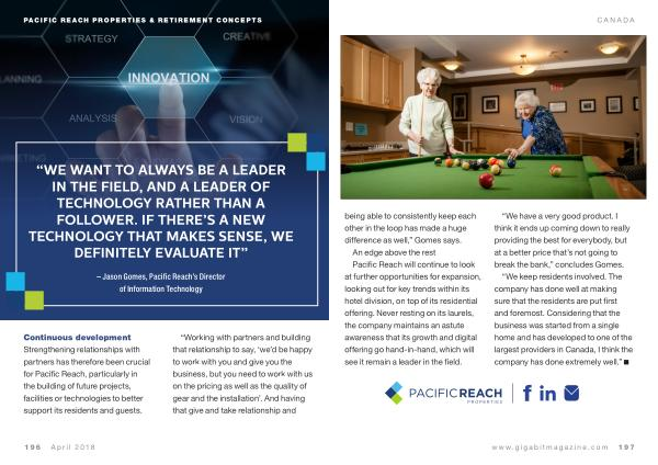 CANADA being able to consistently keep each other in the loop has made a huge difference as well ,” Gomes says . An edge above the rest Pacific Reach will continue to look at further opportunities for expansion , looking out for key trends within its hotel division , on top of its residential offering . Never resting on its laurels , the company maintains an astute awareness that its growth and digital offering go hand-in-hand , which will see it remain a leader in the field .