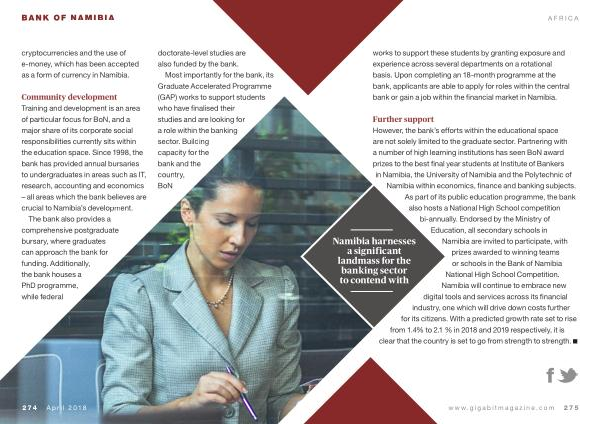 Community development Training and development is an area of particular focus for BoN , and a major share of its corporate social responsibilities currently sits within the education space . Since 1998 , the bank has provided annual bursaries to undergraduates in areas such as IT , research , accounting and economics – all areas which the bank believes are crucial to Namibia ’ s development .