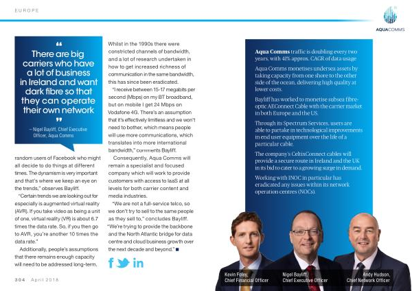 Consequently , Aqua Comms will remain a specialist and focused company which will work to provide customers with access to IaaS at all levels for both carrier content and media industries . “ We are not a full-service telco , so we don ’ t try to sell to the same people as they sell to ,” concludes Bayliff . “ We ’ re trying to provide the backbone and the North Atlantic bridge for data centre and cloud business growth over the next decade and beyond .” 304 April 2018