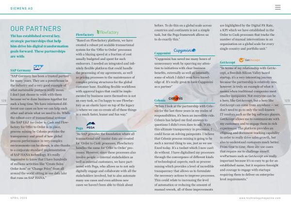 “ SAP Germany has been a trusted partner for many years . They are a powerhouse in the industry and a very good example of what sustainable partners really mean . I don ’ t just choose to work with them because we ’ ve done business together for such a long time . We have reinvented different use cases on how we can help each other and attain what we need to do . While the robust core of transactional systems like SAP ERP for Order to Cash and Flowfactory for Offer to Order is in place , process mining by Celonis provides the transparency and proof of how global process performance in very complex environments can be shown , is also thanks to a corporate standard implementation of SAP HANA technology . It ’ s really impressive to know that I have hundreds of millions activities like “ Create Sales Order item ” or “ Change Price ” from all around the world sitting in one data lake that runs on SAP HANA .”