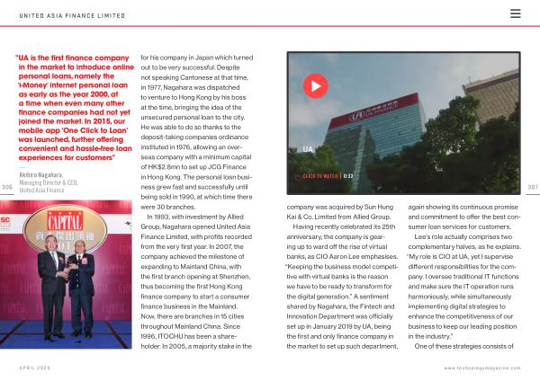 Having recently celebrated its 25th anniversary , the company is gearing up to ward off the rise of virtual banks , as CIO Aaron Lee emphasises . “ Keeping the business model competitive with virtual banks is the reason we have to be ready to transform for the digital generation .” A sentiment shared by Nagahara , the Fintech and Innovation Department was officially set up in January 2019 by UA , being the first and only finance company in the market to set up such department , again showing its continuous promise and commitment to offer the best consumer loan services for customers .
