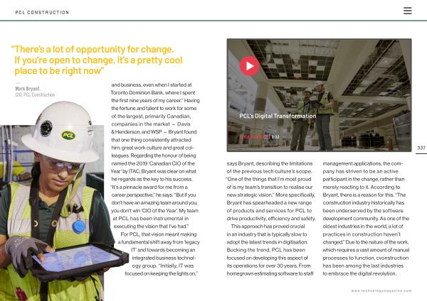 337 says Bryant , describing the limitations of the previous tech culture ’ s scope . “ One of the things that I ’ m most proud of is my team ’ s transition to realise our new strategic vision .” More specifically , Bryant has spearheaded a new range of products and services for PCL to drive productivity , efficiency and safety .