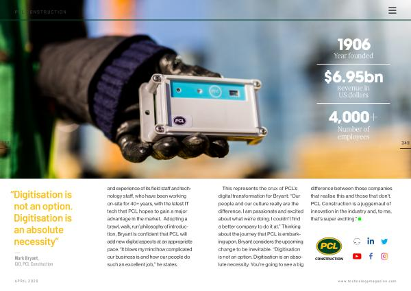 This represents the crux of PCL ’ s digital transformation for Bryant : “ Our people and our culture really are the difference . I am passionate and excited about what we ’ re doing . I couldn ’ t find a better company to do it at .” Thinking about the journey that PCL is embarking upon , Bryant considers the upcoming change to be inevitable . “ Digitisation is not an option . Digitisation is an absolute necessity . You ’ re going to see a big difference between those companies that realise this and those that don ’ t . PCL Construction is a juggernaut of innovation in the industry and , to me , that ’ s super exciting .” www . technologymagazine . com