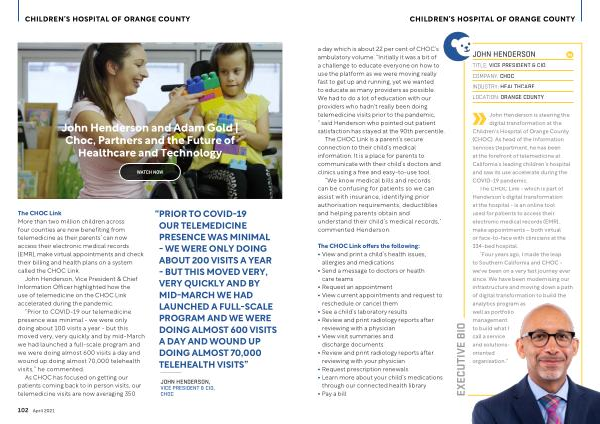 John Henderson is steering the digital transformation at the Children ’ s Hospital of Orange County ( CHOC ). As head of the Information Services Department , he has been at the forefront of telemedicine at California ’ s leading children ’ s hospital and saw its use accelerate during the COVID-19 pandemic .