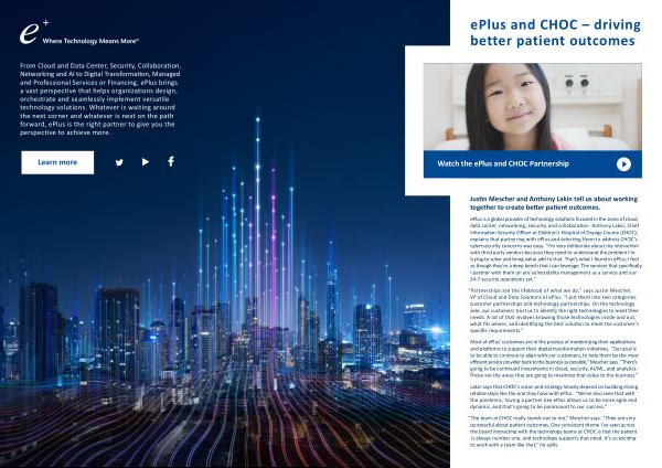 From Cloud and Data Center , Security , Collaboration , Networking and AI to Digital Transformation , Managed and Professional Services or Financing , ePlus brings a vast perspective that helps organizations design , orchestrate and seamlessly implement versatile technology solutions . Whatever is waiting around the next corner and whatever is next on the path forward , ePlus is the right partner to give you the perspective to achieve more .