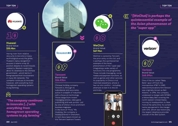 Having risen from relative obscurity to become a heavy technological across the globe , Huawei ’ s name recognition ensures it retains a top 10 position despite its recent travails related to Western suspicions about its closeness to the Chinese government - which led to it being banned from involvement in many 5G networks . The company continues to innovate , however , with everything from homegrown operating systems to pig farming .