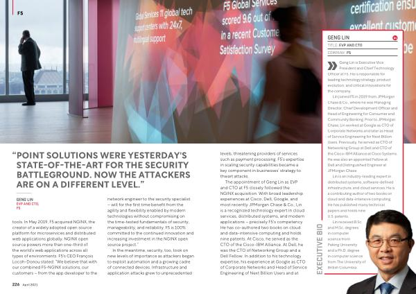 The appointment of Geng Lin as EVP and CTO at F5 closely followed the NGINX acquisition . With broad leadership experiences at Cisco , Dell , Google , and most recently JPMorgan Chase & Co ., Lin is a recognized technology expert in cloud services , distributed systems , and modern applications – precisely F5 ' s competency . He has co-authored two books on cloud and data-intensive computing and holds nine patents . At Cisco , he served as the CTO of the Cisco-IBM Alliance . At Dell , he was the CTO of Networking Group and a Dell Fellow . In addition to his technology expertise , his experience at Google as CTO of Corporate Networks and Head of Service Engineering of Next Billion Users and at