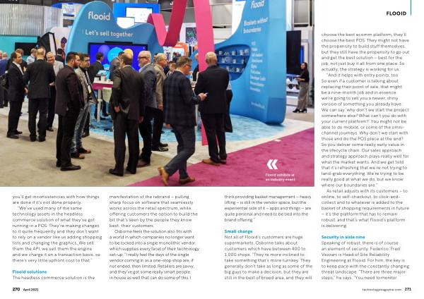Small change Not all of Flooid ’ s customers are huge supermarkets . Osborne talks about customers which have between 400 to 1,000 shops . “ They ’ re more inclined to take something that ’ s more turnkey . They generally don ’ t take as long as some of the big guys to make a decision , but they are still in the best of breed area , and they will choose the best ecomm platform , they ’ ll choose the best POS . They might not have the propensity to build stuff themselves , but they still have the propensity to go out and get the best solution – best for the job , not just buy it all from one place . So actually , the strategy is working for us .