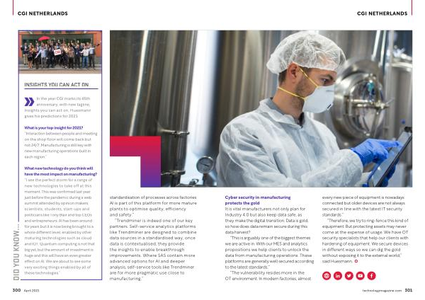 In the year CGI marks its 45th anniversary , with new tagline , Insights you can act on , Huesmann gives his predictions for 2021 .