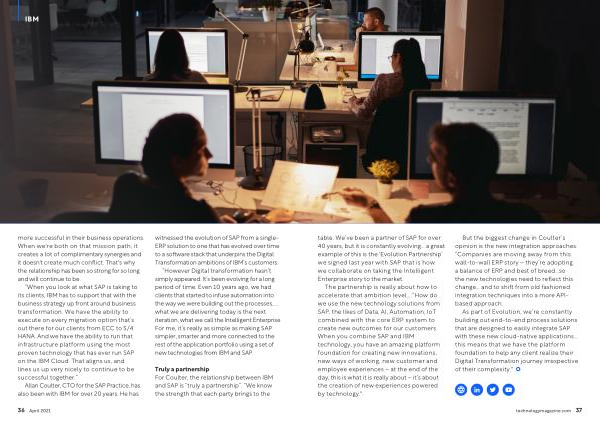 Allan Coulter , CTO for the SAP Practice , has also been with IBM for over 20 years . He has witnessed the evolution of SAP from a single- ERP solution to one that has evolved over time to a software stack that underpins the Digital Transformation ambitions of IBM ’ s customers .
