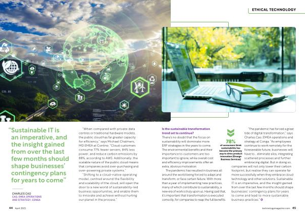 “ The pandemic has forced a great tide of digital transformation ,” says Charles Cao , EMEA operations and strategy at Conga . “ As employees continue to work remotely for the foreseeable future , businesses will have to … eliminate silos , integrating scattered processes and further embracing digital . But in doing so , companies will not only lower their carbon footprint , but realise they can operate far more successfully when they embrace cloud technology and other solutions . Sustainable IT is an imperative , and the insight gained from over the last few months should shape businesses ’ contingency plans for years to come and lead to more sustainable business practices .” technologymagazine . com 45