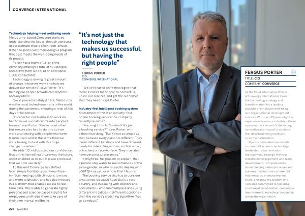 As the Chief Information Officer at Converge International , I lead the technology strategy and transformation for a leading provider of employee well-being and organisational development services . With over 30 years of global experience in various industries , I have a proven track record of delivering innovative and impactful solutions that drive business growth and customer satisfaction .