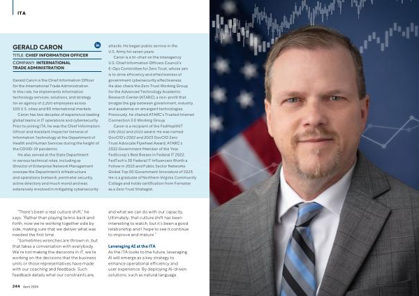 Caron is a recipient of the FedHealthIT 100 2022 and 2023 award . He was named GovCIO ’ s 2022 and 2023 GovCIO Zero Trust Advocate Flywheel Award , ATARC ’ s 2022 Government Member of the Year , FedScoop ’ s Best Bosses in Federal IT 2022 , FedTech ’ s 30 Federal IT Influencers Worth a Follow in 2023 and Public Sector Networks Global Top 50 Government Innovators of 2023 . He is a graduate of Northern Virginia Community College and holds certification from Forrester as a Zero Trust Strategist .