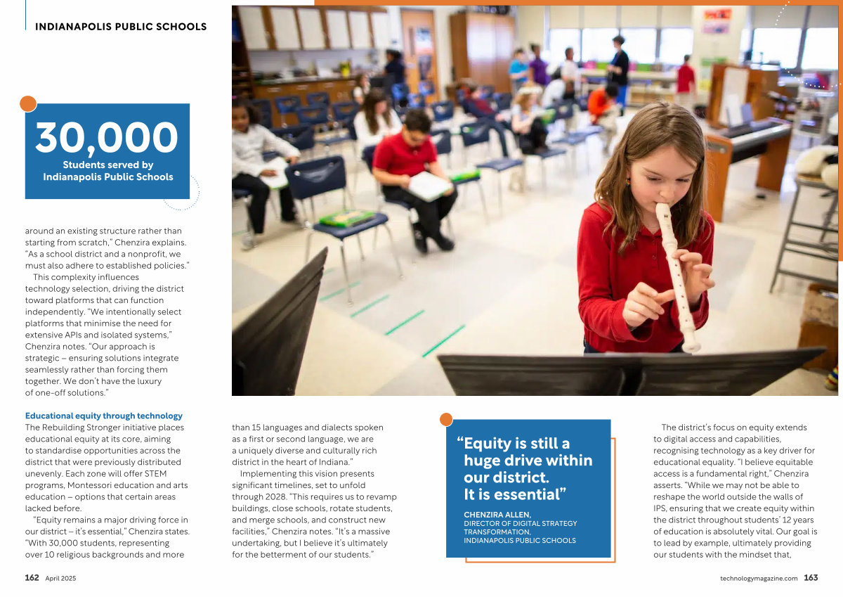 The district’ s focus on equity extends to digital access and capabilities, recognising technology as a key driver for educational equality.“ I believe equitable access is a fundamental right,” Chenzira asserts.“ While we may not be able to reshape the world outside the walls of IPS, ensuring that we create equity within the district throughout students’ 12 years of education is absolutely vital. Our goal is to lead by example, ultimately providing our students with the mindset that,