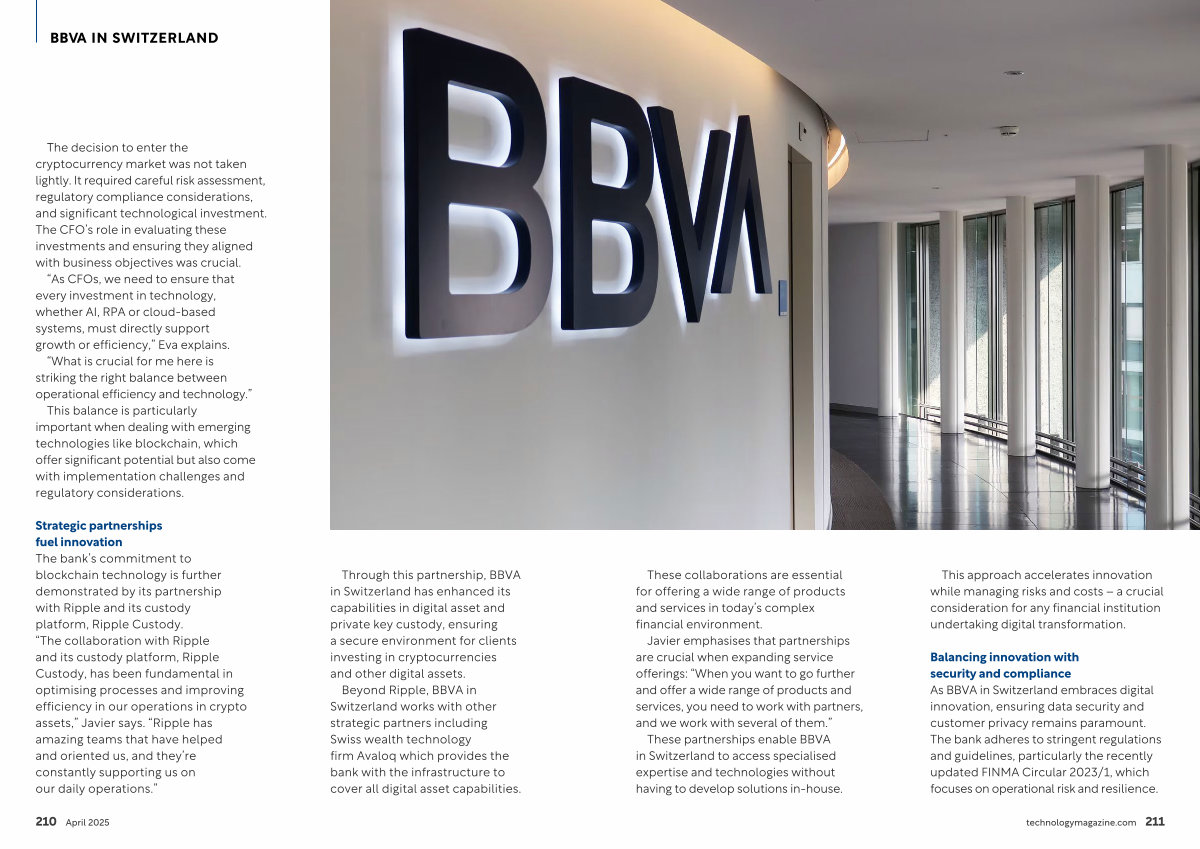 Strategic partnerships fuel innovation The bank’ s commitment to blockchain technology is further demonstrated by its partnership with Ripple and its custody platform, Ripple Custody.“ The collaboration with Ripple and its custody platform, Ripple Custody, has been fundamental in optimising processes and improving efficiency in our operations in crypto assets,” Javier says.“ Ripple has amazing teams that have helped and oriented us, and they’ re constantly supporting us on our daily operations.”