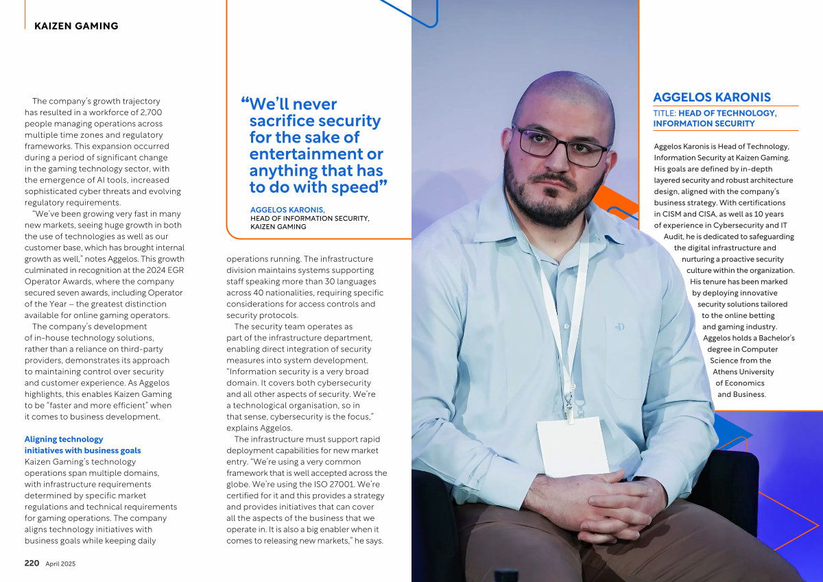 Aggelos Karonis is Head of Technology, Information Security at Kaizen Gaming. His goals are defined by in-depth layered security and robust architecture design, aligned with the company’ s business strategy. With certifications in CISM and CISA, as well as 10 years of experience in Cybersecurity and IT