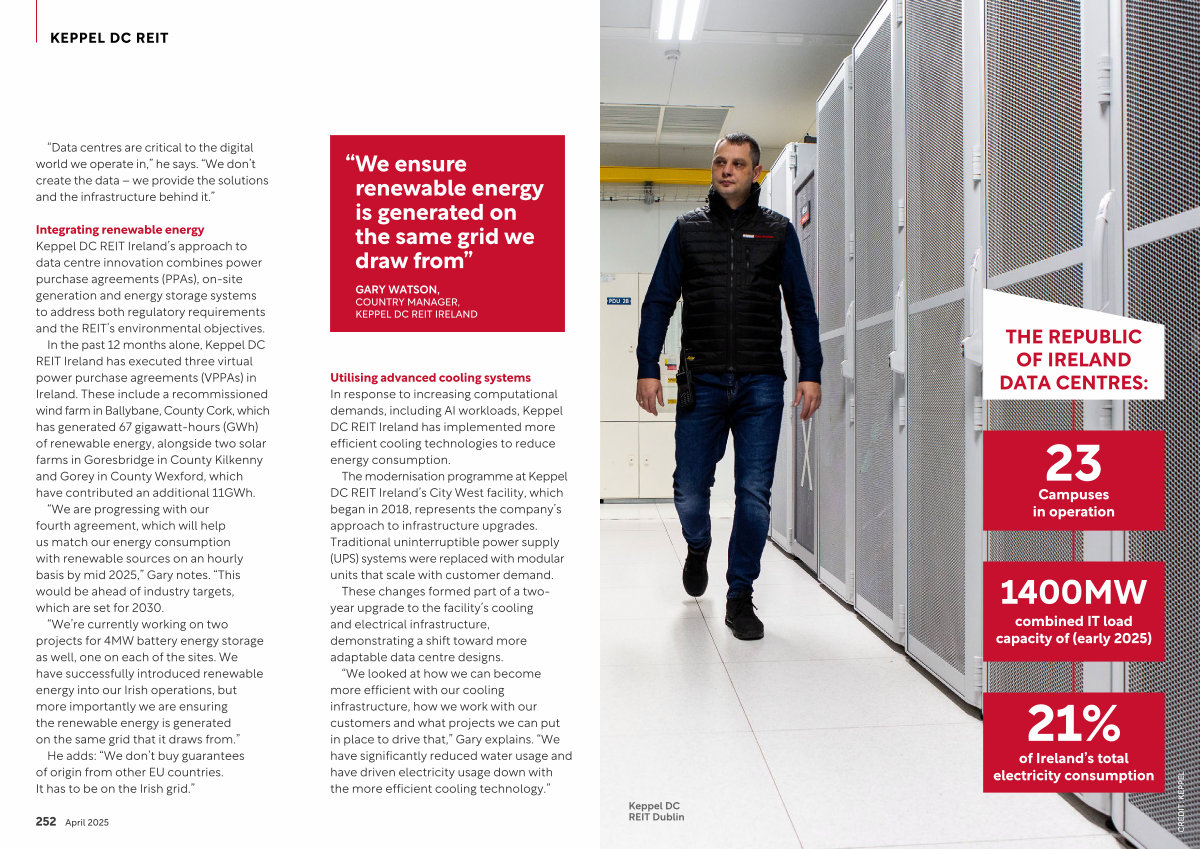 Integrating renewable energy Keppel DC REIT Ireland’ s approach to data centre innovation combines power purchase agreements( PPAs), on-site generation and energy storage systems to address both regulatory requirements and the REIT’ s environmental objectives.