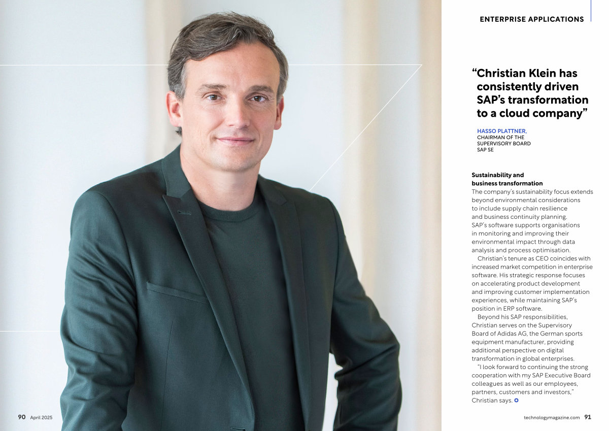 “ I look forward to continuing the strong cooperation with my SAP Executive Board colleagues as well as our employees, partners, customers and investors,” Christian says. technologymagazine. com 91