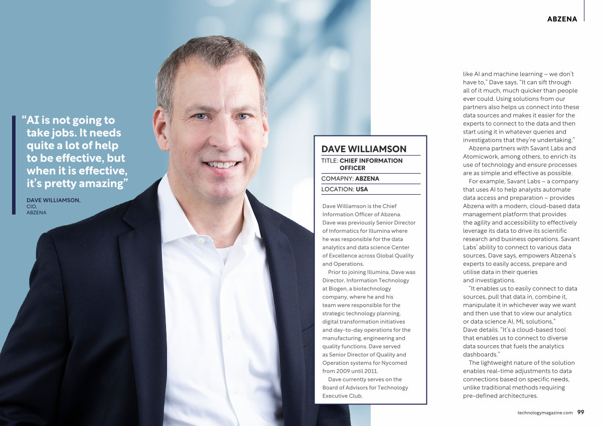 For example, Savant Labs – a company that uses AI to help analysts automate data access and preparation – provides Abzena with a modern, cloud-based data management platform that provides the agility and accessibility to effectively leverage its data to drive its scientific research and business operations. Savant Labs’ ability to connect to various data sources, Dave says, empowers Abzena’ s experts to easily access, prepare and utilise data in their queries and investigations.