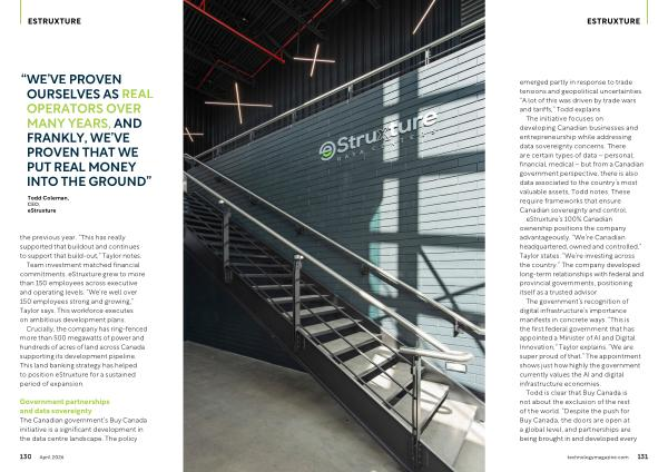 The initiative focuses on developing Canadian businesses and entrepreneurship while addressing data sovereignty concerns. There are certain types of data – personal, financial, medical – but from a Canadian government perspective, there is also data associated to the country’ s most valuable assets, Todd notes. These require frameworks that ensure Canadian sovereignty and control. eStruxture’ s 100 % Canadian ownership positions the company advantageously.“ We’ re Canadian headquartered, owned and controlled,” Taylor states.“ We’ re investing across the country.” The company developed long-term relationships with federal and provincial governments, positioning itself as a trusted advisor.