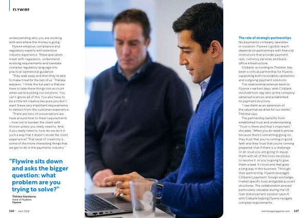 The partnership benefits from established trust and understanding.“ Trust is there and that’ s important,” she adds.“ When you do need to phone because there’ s something going on, they trust that you’ re coming in good faith and they trust that you’ re coming prepared, that if there is a challenge or an issue you are going to equip them with all of the tools necessary to resolve it, or you’ re going to give them a lead. It’ s trust and that goes a long way in this business.” Through their partnership, Flywire leverages Citibank’ s payment, foreign exchange, market specific tools and global account structures. The collaboration proved particularly valuable during the US loan disbursement solution launch, with Citibank helping Flywire navigate complex requirements.