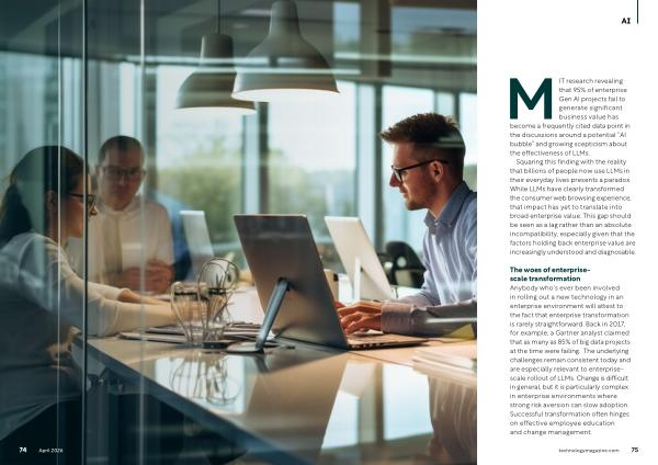 The woes of enterprisescale transformation Anybody who’ s ever been involved in rolling out a new technology in an enterprise environment will attest to the fact that enterprise transformation is rarely straightforward. Back in 2017, for example, a Gartner analyst claimed that as many as 85 % of big data projects at the time were failing. The underlying challenges remain consistent today and are especially relevant to enterprisescale rollout of LLMs. Change is difficult in general, but it is particularly complex in enterprise environments where strong risk aversion can slow adoption. Successful transformation often hinges on effective employee education and change management.