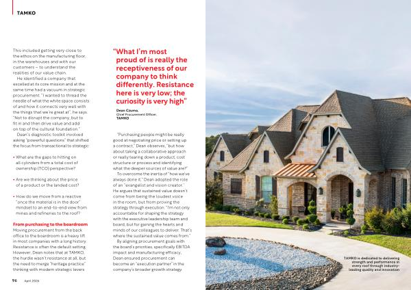 From purchasing to the boardroom Moving procurement from the back office to the boardroom is a heavy lift in most companies with a long history. Resistance is often the default setting. However, Dean notes that at TAMKO, the hurdle wasn’ t resistance at all, but the need to merge“ heritage practice” thinking with modern strategic levers.
