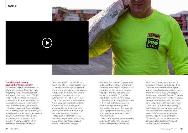 TAMKO meaningful increase in the proactivity and pace at which the sourcing team can move from insight to action.“ dSilo sits at the front of our value creation strategy – and they’ ve been a true partner in tailoring its Procure AI Agents to fit our needs,” Dean says.