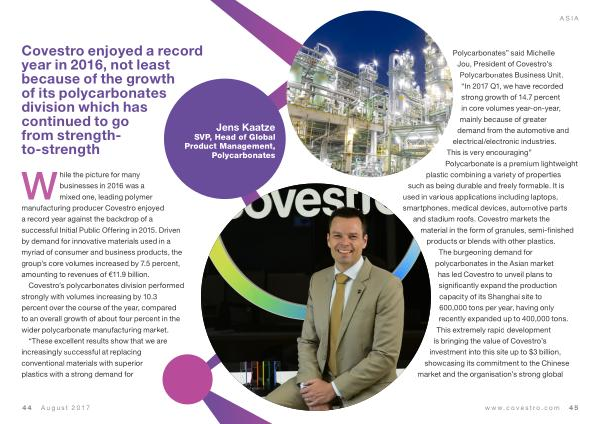 Covestro enjoyed a record year in 2016 , not least because of the growth of its polycarbonates division which has continued to go from strengthto-strength