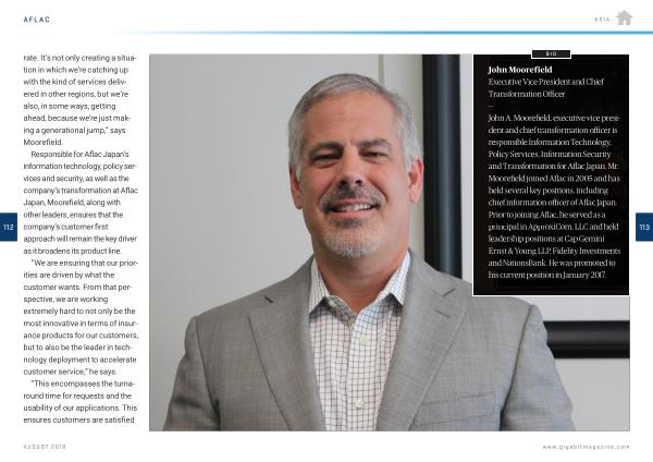 John Moorefield Executive Vice President and Chief Transformation Officer — John A . Moorefield , executive vice president and chief transformation officer is responsible Information Technology , Policy Services , Information Security and Transformation for Aflac Japan . Mr . Moorefield joined Aflac in 2005 and has held several key positions , including chief information officer of Aflac Japan . Prior to joining Aflac , he served as a principal in ApproxiCom , LLC and held leadership positions at Cap Gemini Ernst & Young LLP , Fidelity Investments and NationsBank . He was promoted to his current position in January 2017 .