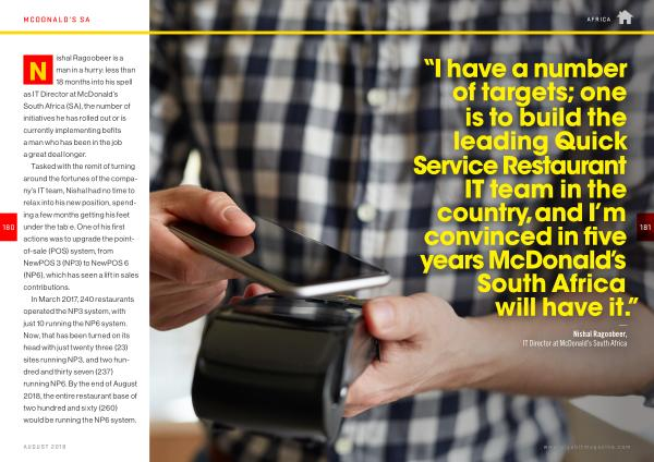 N ishal Ragoobeer is a man in a hurry : less than 18 months into his spell as IT Director at McDonald ’ s South Africa ( SA ), the number of initiatives he has rolled out or is currently implementing befits a man who has been in the job a great deal longer .