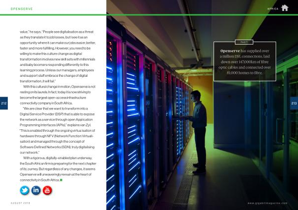 “ We are clear that we want to transform into a Digital Service Provider ( DSP ) that is able to expose the network as a service through open Application Programming Interfaces ( APIs ),” explains van Zyl . “ This is enabled through the ongoing virtualisation of hardware through NFV ( Network Function Virtualisation ) and managed through the concept of Software Defined Networks ( SDN ), truly digitalising our network .”