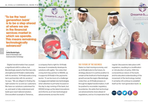 Digital transformation has caused a significant shift in culture , but Benderlioglu asserts that this has only strengthened Al Khaliji ’ s relationship with its vendors . “ Al Khaliji seeks a long term partnership with its vendors ,” he says . “ We are diligent in finding the right solution for us and our customers . We have our solutions customised for us , and seek to fully understand and build upon each tailored solution . One excellent example is Temenos , a company that is right for Al Khaliji because it consistently develops its solutions with agility .” He notes that a long-term key partner is VEDAS , as it supports Al Khaliji in the payments sector . “ It can be more of a challenge to engage and maintain new technologies when attention is primarily focused on the day to day running of the bank , but VEDAS brings us the latest innovations and informs us of new technological advancements across the world .”