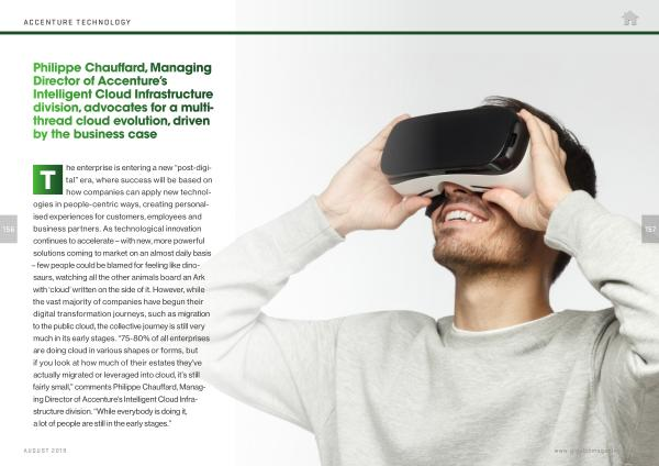 T he enterprise is entering a new “ post-digital ” era , where success will be based on how companies can apply new technologies in people-centric ways , creating personalised experiences for customers , employees and business partners . As technological innovation continues to accelerate – with new , more powerful solutions coming to market on an almost daily basis – few people could be blamed for feeling like dinosaurs , watching all the other animals board an Ark with ‘ cloud ’ written on the side of it . However , while the vast majority of companies have begun their digital transformation journeys , such as migration to the public cloud , the collective journey is still very much in its early stages . “ 75-80 % of all enterprises are doing cloud in various shapes or forms , but if you look at how much of their estates they ’ ve actually migrated or leveraged into cloud , it ’ s still fairly small ,” comments Philippe Chauffard , Managing Director of Accenture ’ s Intelligent Cloud Infrastructure division . “ While everybody is doing it , a lot of people are still in the early stages .”