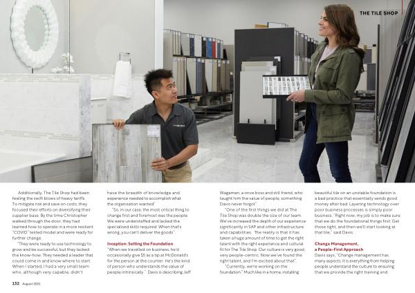 “ One of the first things we did at The Tile Shop was double the size of our team . We ' ve increased the depth of our experience significantly in SAP and other infrastructure and capabilities . The reality is that it has taken a huge amount of time to get the right talent with the right experience and cultural fit for The Tile Shop . Our culture is very good , very people-centric . Now we ’ ve found the right talent , and I ' m excited about that ”.