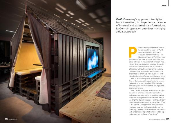 Practice what you preach . That ’ s the ethos at the heart of PwC Germany ’ s ( PwC ) approach to digital transformation . The Advisory division of PwC has two focus streams : one is client services , the other is PwC ’ s in-house transformation . The idea is that one begets the other . So while the internal transformation is aimed at efficiency without interruption to ongoing business , the external transformation is expected to drum up new business and digitalise the core offering to advisory services .