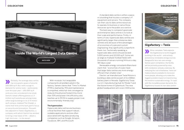 Globally , the average data centre has occupied a space of around 100,000 sq ft . But , with a surge in demand for online tools – particularly over this past year – 100,000 sq ft units are now considered to be small . Switch ’ s latest offering places a 1.3 million sq ft warehouse among many other large buildings in its 17.4 million sq ft campus , dubbed The Citadel , a name that hints at the tech giant ’ s focus on security and innovation . The park lies adjacent to Tesla ’ s Gigafactory , a company with which Switch has worked to bring a new lease of life – albeit a high-tech one – to the desert .