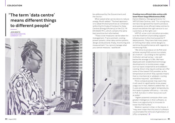 “ We strive to produce a 1.0x PUE and achieve varying PUEs across our estate , all of which – according to the Uptime Institute ’ s annual survey – are well below the average of 1.58x . We have deployed well-established technology developments to tackle power usage such as liquid , evaporative and adiabatic cooling . Direct chip liquid cooling can offer some of the lowest PUE possible , as the temperature at which they operate means that no mechanical or adiabatic cooling would be required ,” said Watkins .