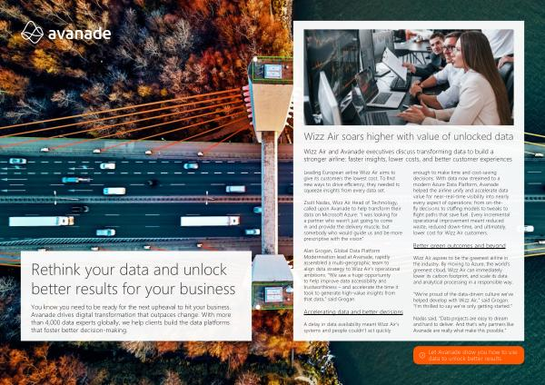 enough to make time and cost-saving decisions . With data now streamed to a modern Azure Data Platform , Avanade helped the airline unify and accelerate data value for near-real-time visibility into nearly every aspect of operations : from on-thefly decisions to staffing models to tweaks to flight paths that save fuel . Every incremental operational improvement meant reduced waste , reduced down-time , and ultimately , lower cost for Wizz Air customers .