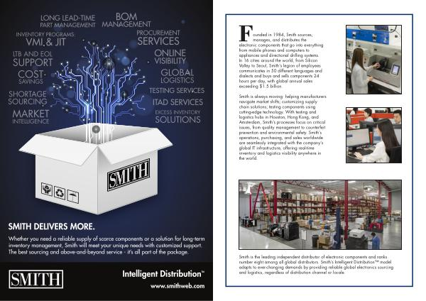 Smith is the leading independent distributor of electronic components and ranks number eight among all global distributors . Smith ’ s Intelligent Distribution™ model adapts to ever-changing demands by providing reliable global electronics sourcing and logistics , regardless of distribution channel or locale .