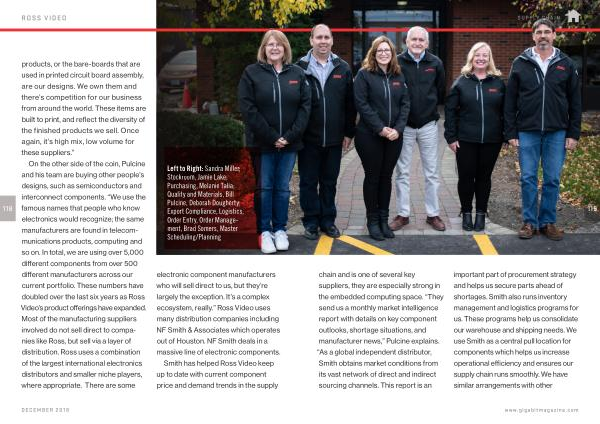 electronic component manufacturers who will sell direct to us , but they ’ re largely the exception . It ’ s a complex ecosystem , really .” Ross Video uses many distribution companies including NF Smith & Associates which operates out of Houston . NF Smith deals in a massive line of electronic components .