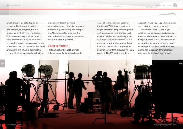 NORTH AMERICA chain challenge to Ross Video ’ s traditional PCBA-based work as it began manufacturing servers specifically engineered for the broadcast market . “ We buy commercially available , high-end motherboards , CPUs and disc drives , and assemble them to make a custom-built application specific server that is uniquely a Ross product . The XPression graphics acquisition was key to sparking a major spurt of growth in the company .”