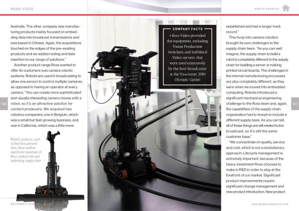 Another product range Ross wanted to offer its customers was camera robotic systems . Robots are used in broadcasting to allow one person to control multiple cameras , as opposed to having an operator at every camera . “ You can create more sophisticated and visually interesting camera moves with a robot , so it ’ s an attractive solution for content producers . We acquired two robotics companies ; one in Belgium , which was a small but fast-growing business , and one in California , which was a little more