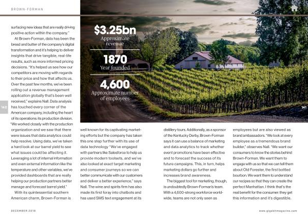 141 distillery tours . Additionally , as a sponsor of the Kentucky Derby , Brown-Forman says it can use a balance of marketing and data analytics to track whether event promotions have been effective and to forecast the success of its future campaigns . This , in turn , helps marketing dollars go further and increases brand awareness .