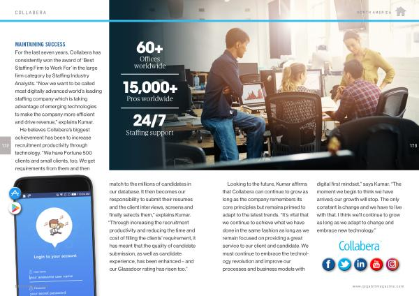 For the last seven years , Collabera has consistently won the award of ‘ Best Staffing Firm to Work For ’ in the large firm category by Staffing Industry Analysts . “ Now we want to be called most digitally advanced world ’ s leading staffing company which is taking advantage of emerging technologies to make the company more efficient and drive revenue ,” explains Kumar .