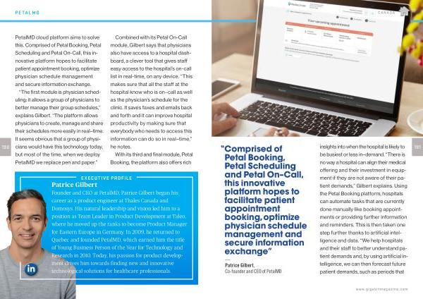 CANADA “Comprised of Petal Booking , Petal Scheduling and Petal On – Call , this innovative platform hopes to facilitate patient appointment booking , optimize physician schedule management and secure information exchange ”