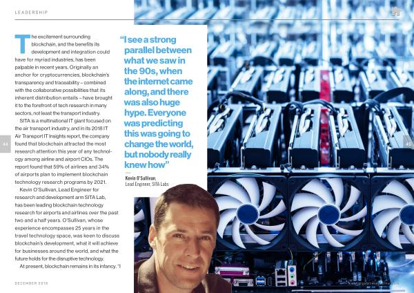 SITA is a multinational IT giant focused on the air transport industry , and in its 2018 IT Air Transport IT Insights report , the company found that blockchain attracted the most research attention this year of any technology among airline and airport CIOs . The report found that 59 % of airlines and 34 % of airports plan to implement blockchain technology research programs by 2021 . Kevin O ’ Sullivan , Lead Engineer for research and development arm SITA Lab , has been leading blockchain technology research for airports and airlines over the past two and a half years . O ’ Sullivan , whose experience encompasses 25 years in the travel technology space , was keen to discuss blockchain ’ s development , what it will achieve for businesses around the world , and what the future holds for the disruptive technology .