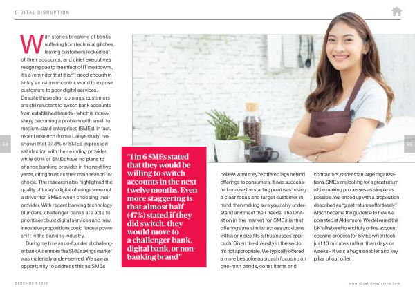 55 believe what they ’ re offered lags behind offerings to consumers . It was successful because the starting point was having a clear focus and target customer in mind , then making sure you richly understand and meet their needs . The limitation in the market for SMEs is that offerings are similar across providers with a one size fits all businesses approach . Given the diversity in the sector it ’ s not appropriate . We typically offered a more bespoke approach focusing on one-man bands , consultants and contractors , rather than large organisations . SMEs are looking for a great return while making processes as simple as possible . We ended up with a proposition described as “ great returns effortlessly ” which became the guideline to how we operated at Aldermore . We delivered the UK ’ s first end to end fully online account opening process for SMEs which took just 10 minutes rather than days or weeks - it was a huge enabler and key pillar of our offer .